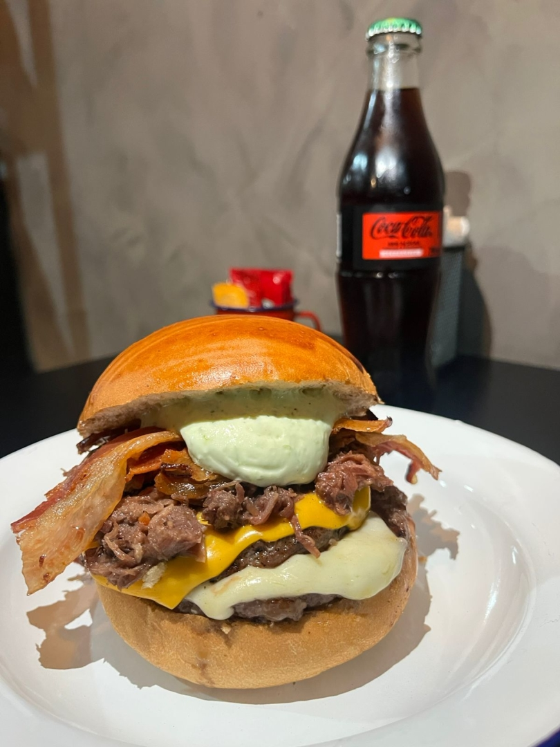 Pão super macio, 2 carnes 70g, queijo mussarela e cheddar, bacon crocante e maionese da casa e costela bovina defumada e desfiada