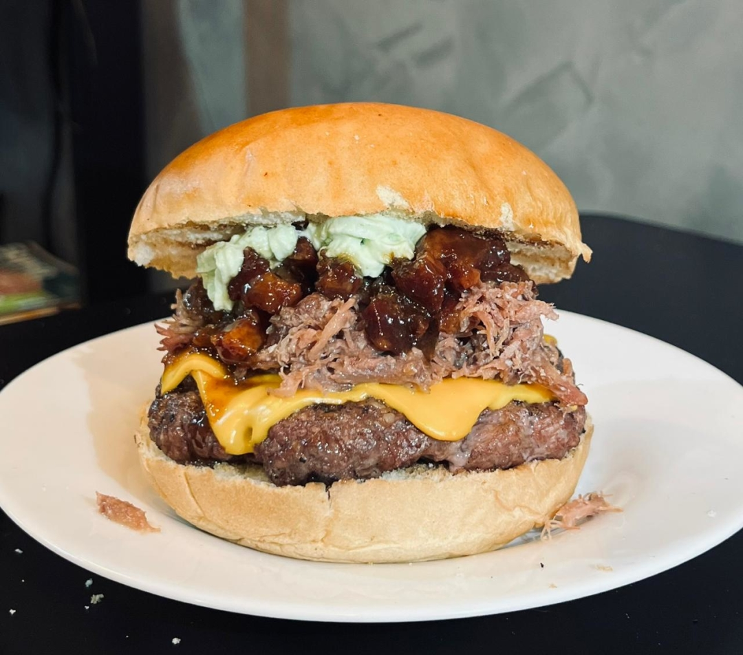 Pão super macio, carne 120g, queijo cheddar fatiado, geleia de bacon, costela defumada e desfiada, maionese da casa