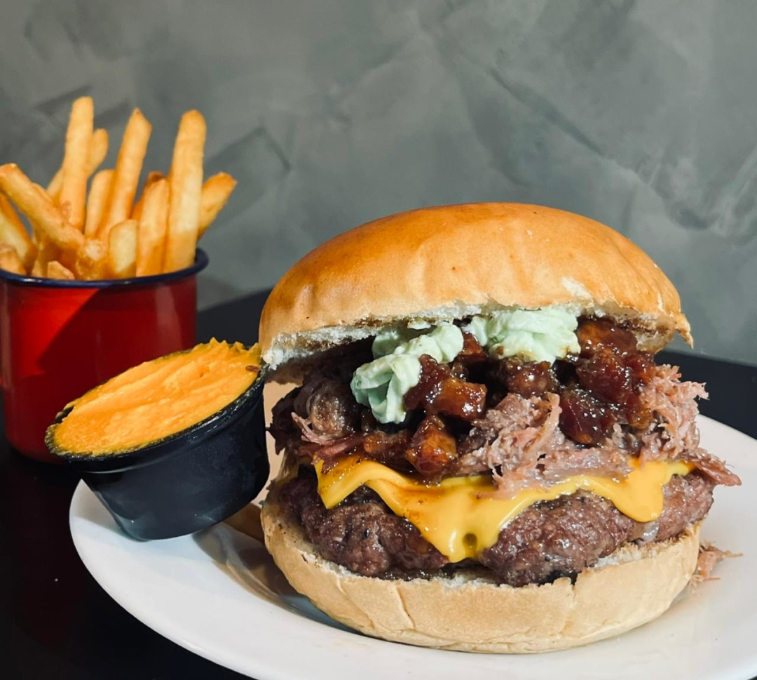 Pão super macio, carne 120g, queijo cheddar fatiado, geleia de bacon, costela defumada e desfiada, maionese da casa