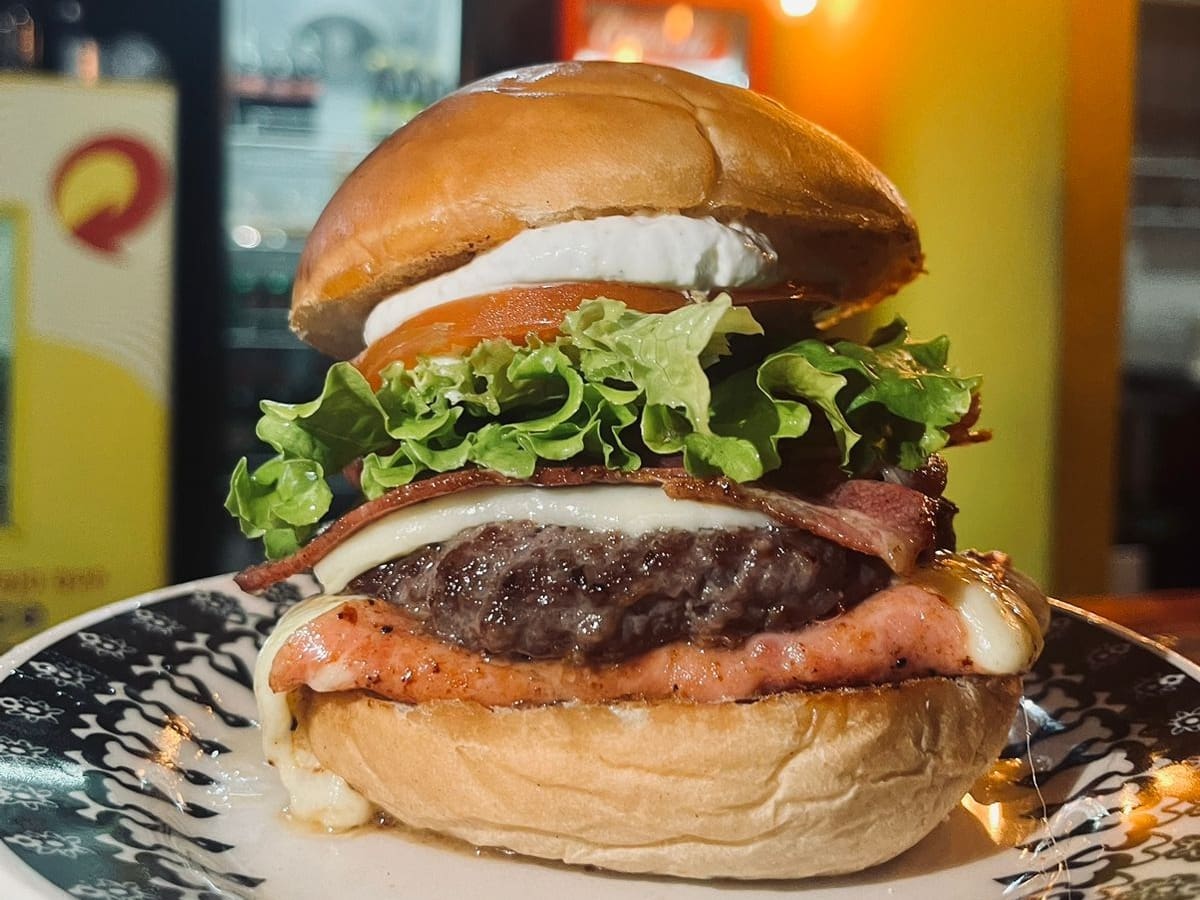 Pão super macio, 2 carnes 70g, queijo mussarela e cheddar, bacon crocante e maionese da casa